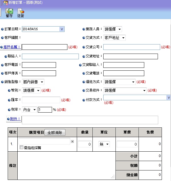 2. 依序填入產品基本資料 (紅色字體為必填欄位),按上方「完成」或「送簽」,隨即新增一筆訂單。