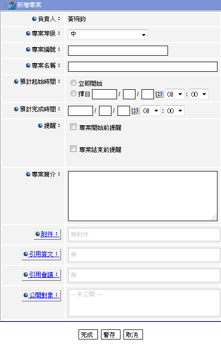 2. 填寫負責人、專案等級、專案名稱、預計起始時間、預計完成時間、提醒(開始前提醒、結束前提醒,並可選擇是以訊息方式或鬧鈴方式提醒)、專案簡介、附件、引用簽文、引用會議、公開對象,按下方「完成」,隨即新增一筆專案資料。