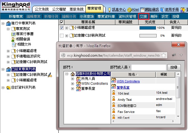4. 點選待交接之進行中專案的【負責人】,系統跳出【挑選對想小幫手】選擇欲交接對象。