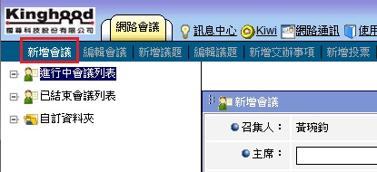 2.填寫主席、紀錄、會議名稱、開始時間、截止時間、會議簡介、與會人員、附件,即可開始這項會議。