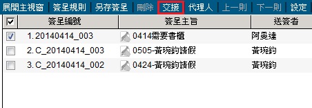同時簽呈會歸至交接人的進行中文件夾中。(進行中被公開的簽呈不可交接)。