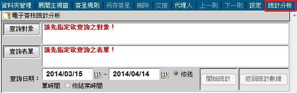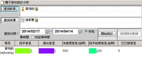 2. 選擇查詢對象、查詢表單、查詢日期、依送單時間、依結案時間,並點選「開始統計」頁面將呈現統計結果。