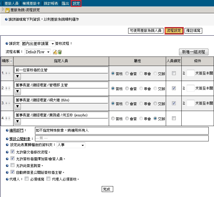 可針對國內出差申請單、國外出差申請單、報支單簽核流程做設定,省去發文時不知該如何設定流程的困擾。