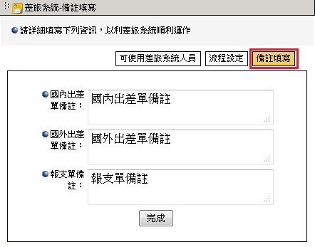可自行填寫國內出差單、國外出差單、報支單三張表單的備註事項,讓發文者於發文時可以清楚了解此簽呈的用法與規範。