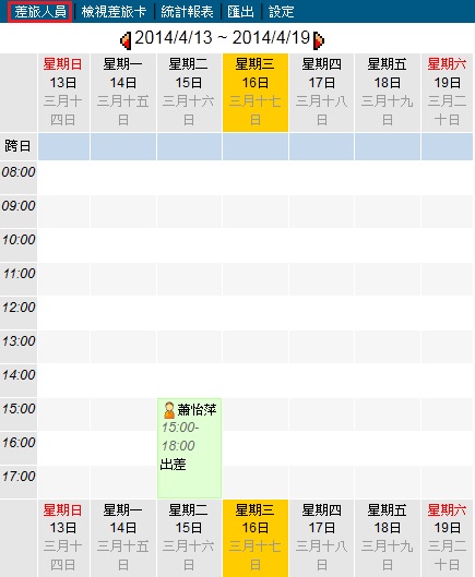 系統自動抓取國內、國外出差申請單送簽核准的人員,並以行事曆每週的方式呈現。