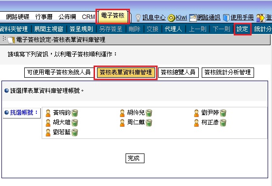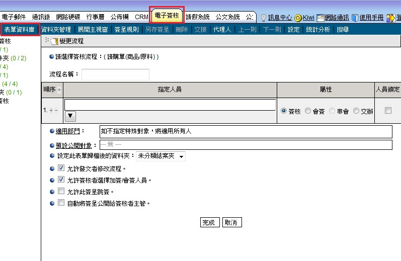 請點入「 設定」完成各公文表單的簽核流程設定及於簽呈總覽內歸屬系統資料夾的設定。