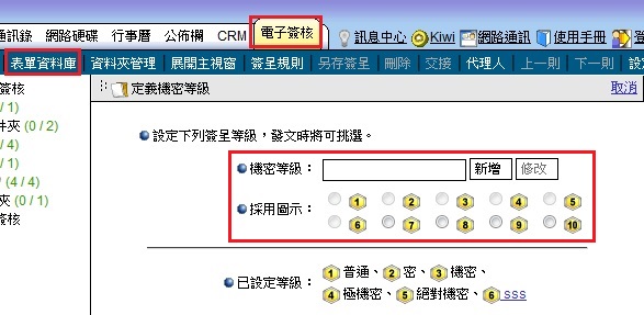 ※限制機密等級,可挑選限/不限,勾選限制,可挑選等級;若未勾選表全部等級皆可觀看。