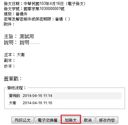 3. 加發文:須再加發公文時,請先於結案公文內開啟公文,再點選下方「加發文」,在正、副、抄本人員內填入加發人員的全銜、通訊資料及發文日期後按儲存,由系統拋轉一份原發文字號加支號的公文至待發公文內,由發文人員執行發文事宜。