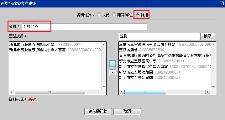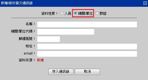 b. 新增中的資料性質分為:人員、機關單位、群組。