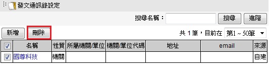 於發文通訊錄設定內,來源若為系統則無法刪除,來源為自建則可刪除。