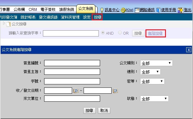 b. 點選「進階搜尋」,可針對簽呈編號、簽呈主旨、字號、收發文日期區間、來文單位等多項內容交叉尋找。
