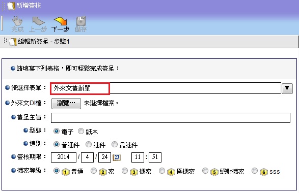 1. 當有外來文時,請將電子交換來文儲存成DI格式以及PDF格式,若有附件也請一併下載; 若是實體來文,請掃描成圖檔。 2. 於電子簽核點選「新增簽呈」,挑選外來文簽辦單。