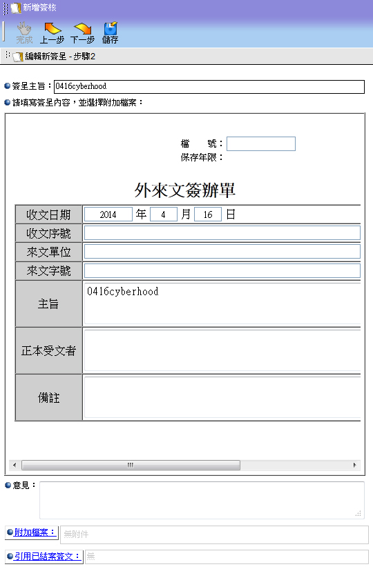 6. 送出後就會將外來文送到承辦人員手中,承辦人員即可簽核,簽核後自動結案。