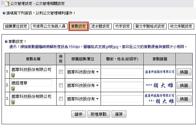 1. 列印公文須連同章戳一倂印出時,請先做此項設定,於新增公文簽呈或發文時選入章戳樣式即可。