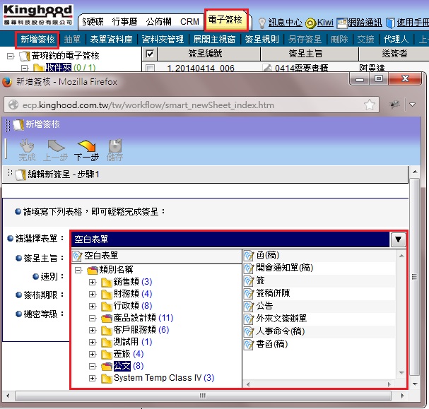 點「新增簽核」,於選擇表單下拉選單點選「公文」,再選取【函(稿)、簽稿並陳、簽、開會通知單(稿)、公告(稿)】其中一張表單,輸入對外發文組織/單位、簽呈主旨、簽核期限、機密等級及速別(預設為普通件)後,按「下一步」進入下一個畫面。