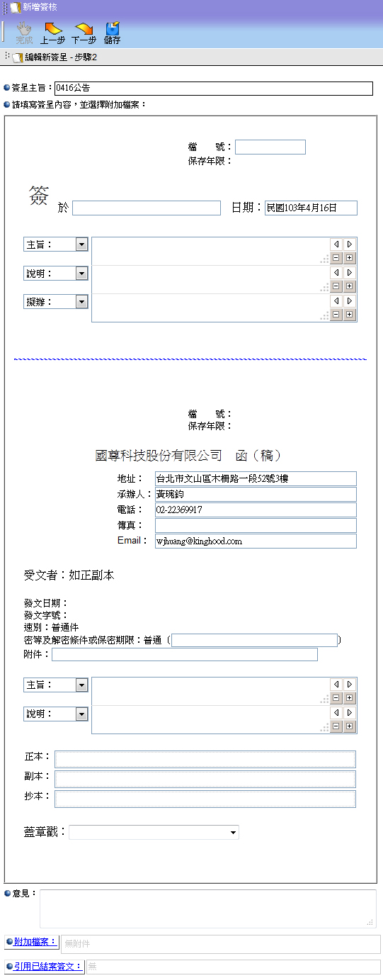 i. 公文尚未編寫完成,須暫時離開,可按「儲存」,將公文暫存至草稿夾內,事後再至電子簽核/草稿夾內開啟公文繼續編寫。
