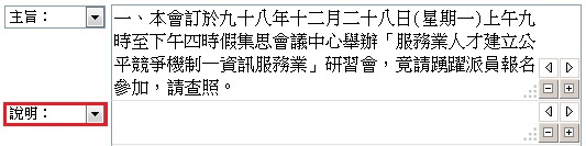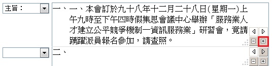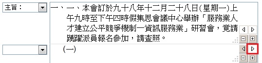 c. 選入段落標題(主旨),輸入此段內文,結束後於右方點選「 」,新增第二段,可利用 做編號的增或減縮排,若非相同段落標題,於第二段選入段落標題(說明)後,編號即自動消失。