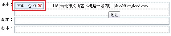 1) 輸入受文者全銜或明確之總稱,完成後按Enter,出現職稱、郵遞區號、地址、Email等欄位,可依實際需求(如郵寄…等)自行輸入,當此公文送出後,此通訊資料會自動存入資料庫,下次再輸入時系統會做關鍵字搜尋,跳出視窗供選取。
