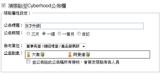 h. 若為公告(稿)且須張貼,尚須輸入張貼屬性,由發文人員直接依設定內容張貼至Cyberhood公佈欄。