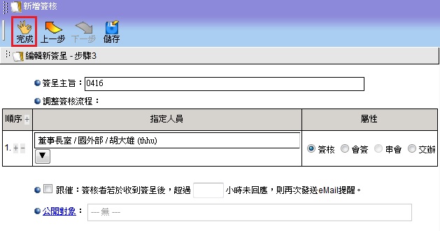 調整簽核流程,設定跟催條件及公開對象後,按「完成」即可送出簽核。