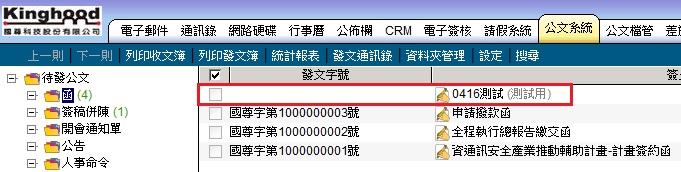 1. 公文核准後,由系統自動拋轉至公文系統/待發公文內,待發文人員處理發文事宜("簽"直接拋轉至公文系統/結案公文內歸檔)。