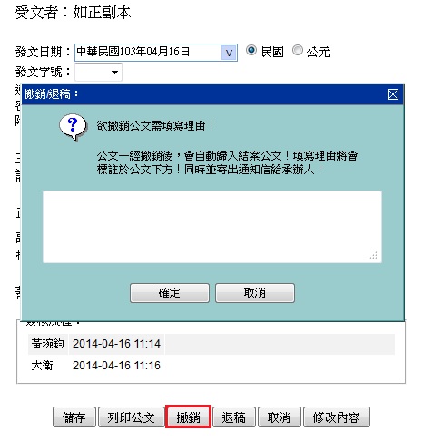 還沒押字號前才可撤銷,表示該公文雖已簽核完畢,但可能因某些原因不需將公文發出,此時可以點選按鈕來撤銷,一經撤銷後會自動歸入結案公文!但同樣需要填寫原因,此原因將會標註於公文下方!同時並寄出通知信給承辦人!公文一經撤銷後,會自動歸入結案公文!填寫理由將會標註於公文下方!同時並寄出