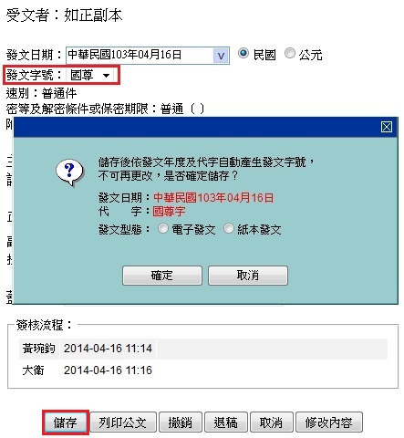 b. 僅第一次儲存有效,再次儲存,已產生發文字號不變。