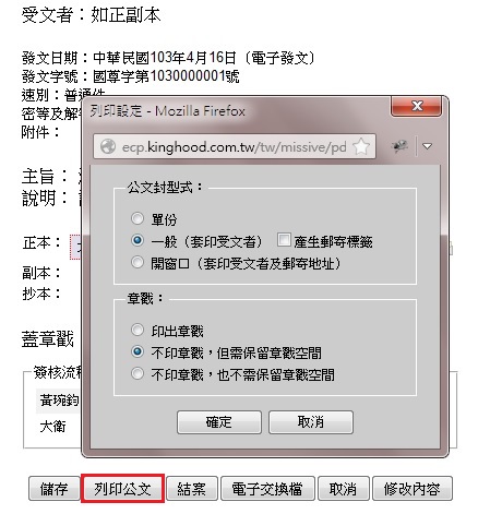 a. 發文字號已儲存後,即可列印發送,選取公文封型式,章戳是否列印及章戳空間是否保留。