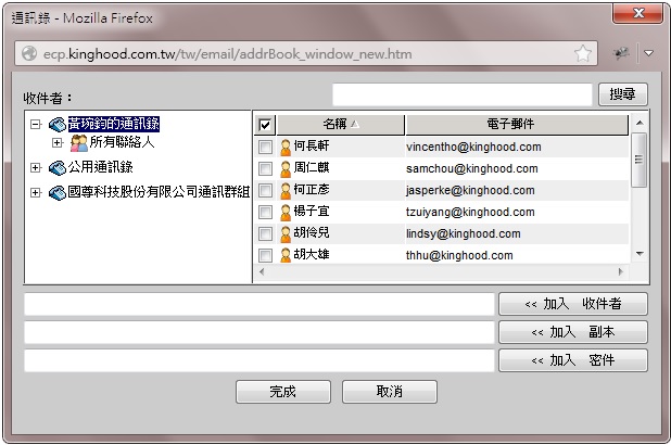 3. 也可直接點選前方文字將跳出挑選小幫手,視窗中「收件者、副本、密件」人員可一併選擇。