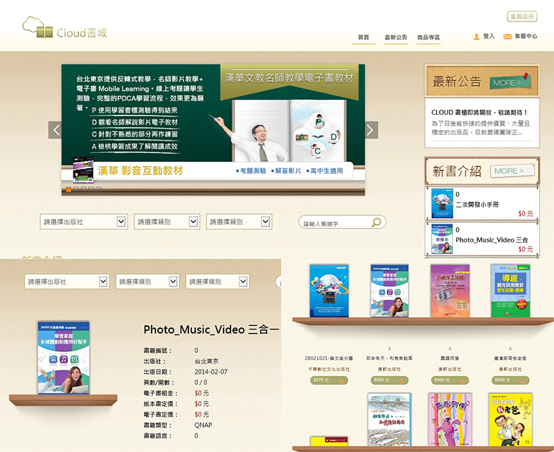 | ◎『Cloud書城』 集結眾多出版社、補教業者提供線上電子書,範圍從休閒圖書到影音教學教材…等等各類書籍,更可結合上述『Cloud轉書』、『Cloud書櫃』機制,將轉檔後的書籍放到書櫃內,提供眾多使用者線上觀看。 |